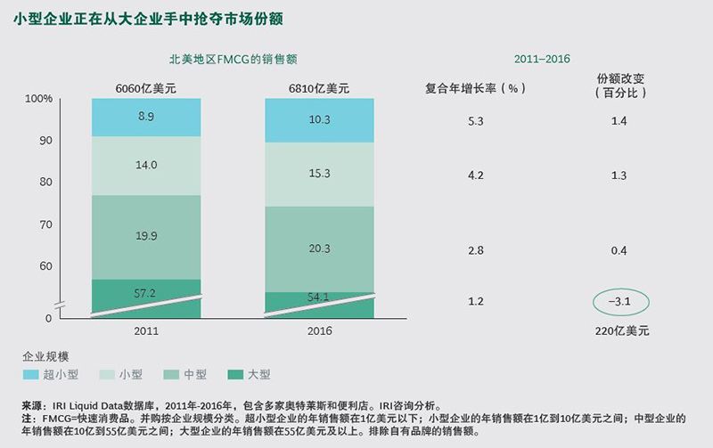 過去50年,跨國(guó)消費(fèi)品企業(yè)強(qiáng)化品牌、擴(kuò)展產(chǎn)品組合、穩(wěn)步提高市場(chǎng)占有率和收入,創(chuàng)造了強(qiáng)大的股東價(jià)值。那曾是大媒體、大零售商、大品牌的時(shí)代。大約五年前,規(guī)模較小的企業(yè)和品牌首次開始瓜分大品牌的蛋糕。在2011年到2016年間,北美地區(qū)大約220億美元的行業(yè)銷售從大企業(yè)轉(zhuǎn)移到小企業(yè)。歐洲也經(jīng)歷了同樣的改變。
